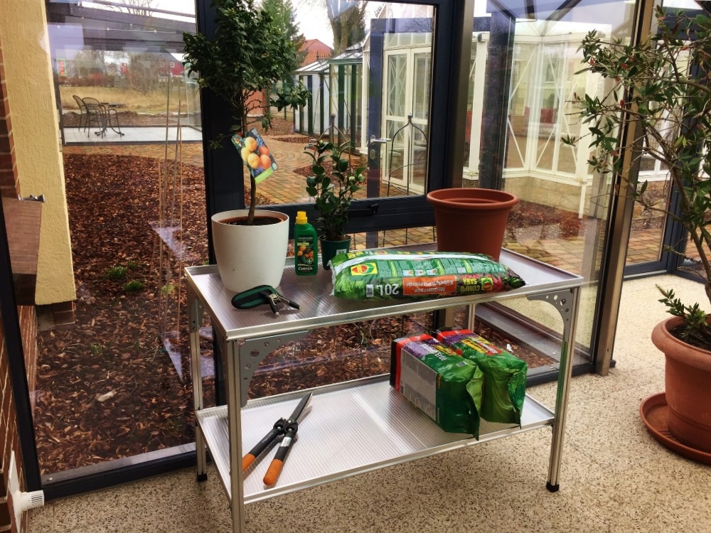 Der freistehende Arbeitstisch bietet Ihnen eine mobile Arbeitsffläche auf einer angenehmen Höhe. Er besteht aus robusten Aluminiumprofilen inkl. 2 Kunststoffeinlegeböden. Im Frühjahr kann man hier bequem die Anzucht vornehmen, Umtopfen oder oder... und im Sommer kann er auch außerhalb des Gewächshauses genutzt werden. Dann ist der Platz im Gewächshaus anderweitig belegt.