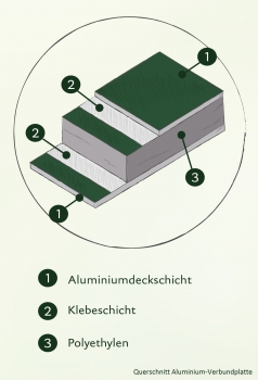 - Die Aluminium-Verbundplatten sind beidseitig unterschiedlich beschichtet (silber / anthrazit-grau)